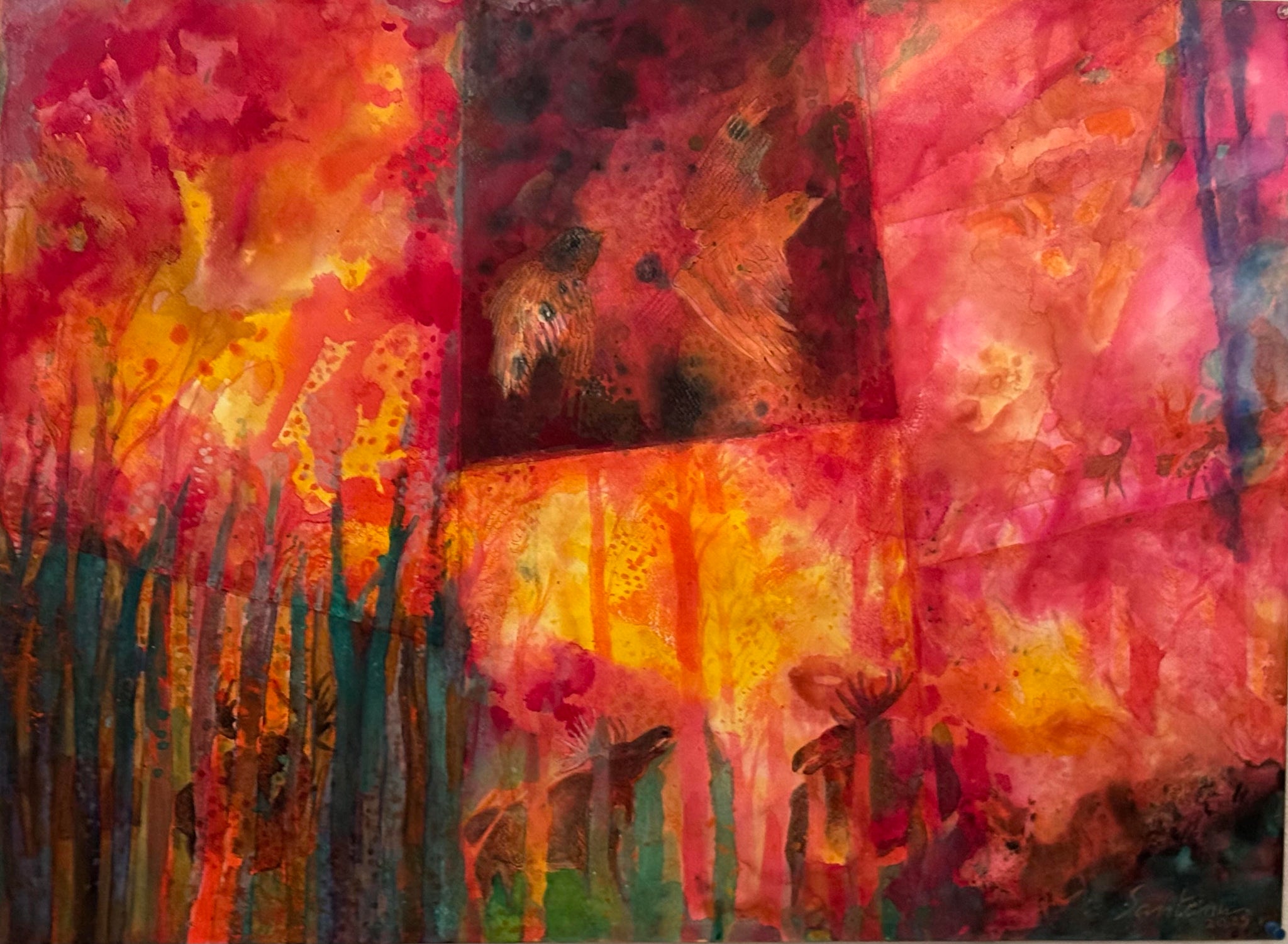 This painting tells the stories of the jungle’s inhabitants in the searing moment when fire descends upon their world.